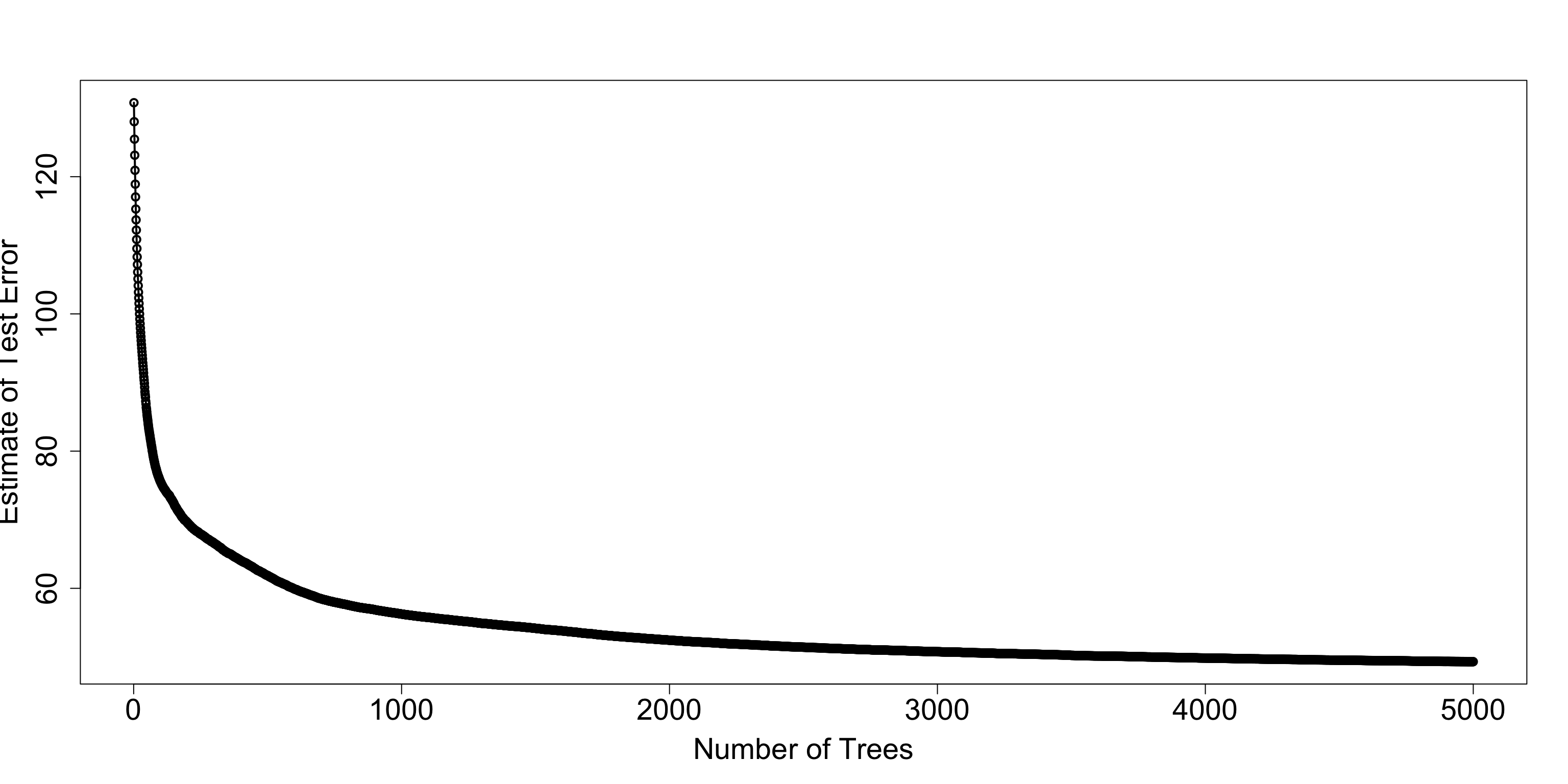 - Use these tuning parameters to evaluate cross-validation loss for up to 5000 trees