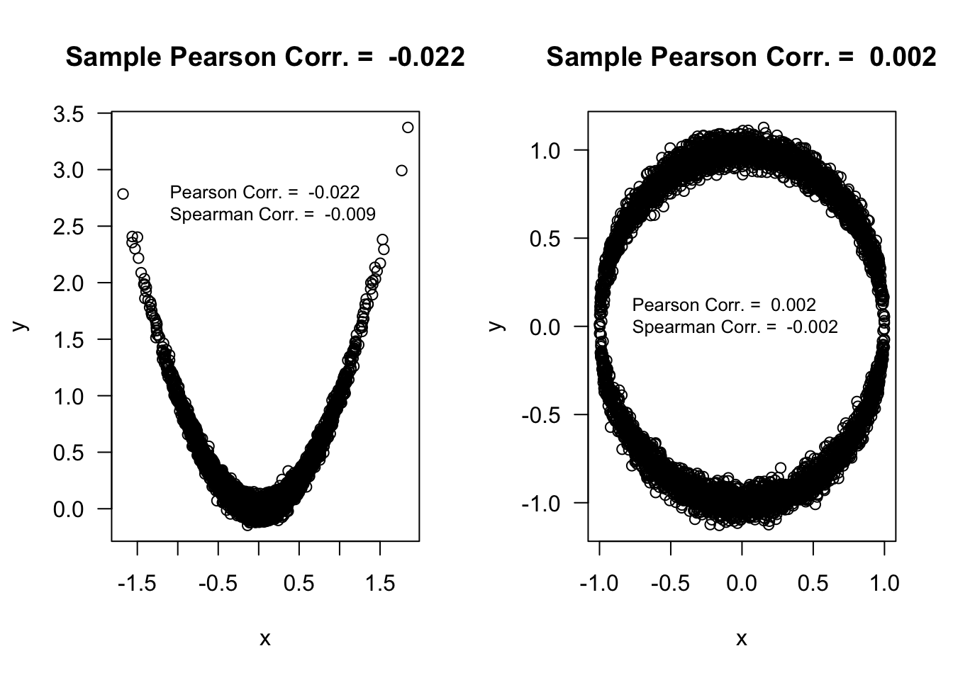 round(c(p.cor1, kend.cor1, spear.cor1, d.cor1), 4) ## parabola## [1] -0.0124 0.0077 0.0109 0.5268